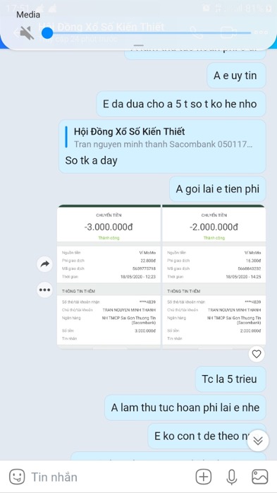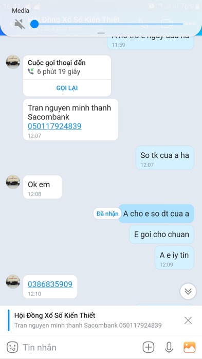 Anh Dũng kể: "Mới đây tôi nhận được một cuộc điện thoại từ số lạ, với nội dung: Người gọi điện xưng là nhân viên đang làm việc tại Công ty Xổ số Kiến thiết có trụ sở ở TP.HCM, "gạ" tôi "mua số" để đánh đề. Cụ thể, hắn ta nói "nếu tôi muốn biết 2 số trong dãy số sẽ được xổ vào ngày hôm sau thì sẽ được... toại nguyện, với điều kiện tôi chuyển vào tài khoản của hắn 5 triệu đồng. Đồng thời, hắn cũng đưa cho tôi số tài khoản cá nhân kèm lời hứa là "bọn tôi làm ăn uy tín". Hắn còn đưa tôi số điện thoại trên Zalo với tên "Hội đồng Xổ số Kiến thiết trụ sở TP.HCM". Tôi đã đăng nhập vào tài khoản Zalo này để kiểm tra và thấy đúng là tên đó. Tin lời, tôi đã chuyển vào tài khoản số 050117924839 Ngân hàng Sacombank, tên chủ tài khoản là Tran Nguyen Minh Thanh số tiền 5 triệu đồng".