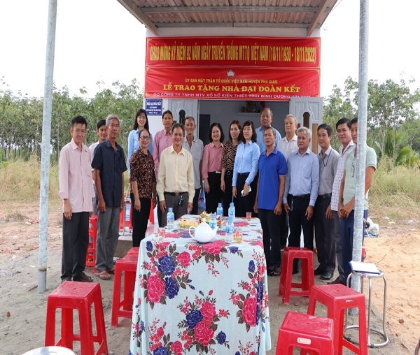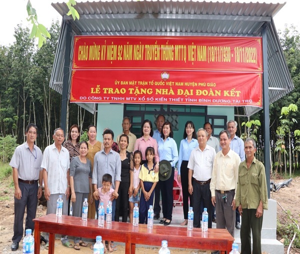 Nối tiếp chuỗi hoạt động từ thiện trao tặng nhà Đại đoàn kết năm 2022, ngày 21/11, Công ty TNHH MTV Xổ số Kiến thiết Bình Dương phối hợp với Ủy ban Mặt trận Tổ quốc Việt Nam huyện Phú Giáo đã tổ chức Lễ trao tặng 05 căn nhà Đại đoàn kết cho hộ nghèo có hoàn cảnh khó khăn về nhà ở tại huyện Phú Giáo.