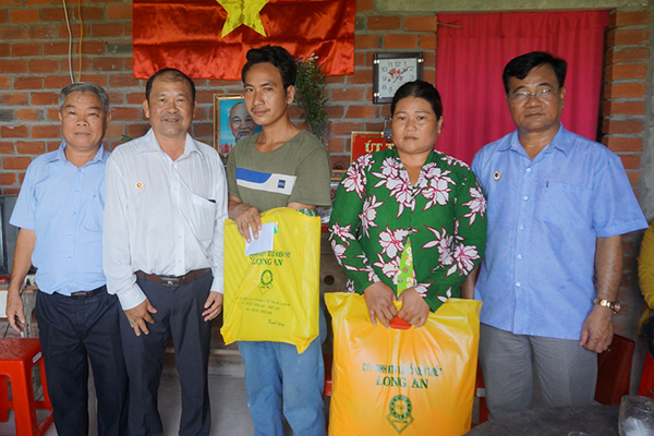 Chủ tịchHĐTVCông ty TNHH MTV Xổ số Kiến thiết Long An – Võ Văn Truyền (thứ 2, trái sang) trao quà cho ông Nguyễn Văn Vũ