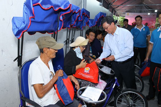 Đại diện Lãnh đạo Công ty TNHH MTV Xổ số kiến thiết TPHCM tặng xe lăn cho người nghèo khuyết tật.