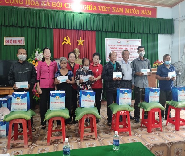 Ông Đinh Việt Tiến – Chủ tịch Công ty trao quà cho người nghèo tại Hội >trường Chữ Thập đỏ huyện trảng Bom.