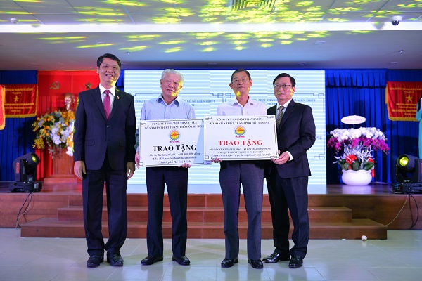 Lãnh đạo Công ty trao số tiềnủng hộ Quỹ vì người nghèo và Quỹ bảo trợ bệnh nhân nghèo TP.HCM