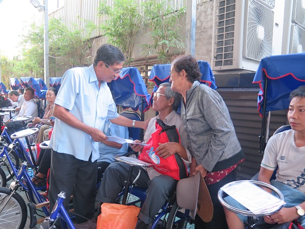 Ông Nguyễn Văn Rảnh - Phó Chủ tịch Hội Bảo trợ bệnh nhân nghèo Thành phố hỏi thăm và trao quà cho người khuyết tật