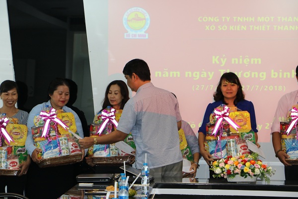 Ông Nguyễn Quốc Chiến - Chủ tịch Hội đồng thành viên Công ty TNHH MTV Xổ số kiến thiết TP.Hồ Chí Minh trao quà cho cán bộ - nhân viên Công ty có người thân là thương binh, liệt sỹ nhân kỷ niệm ngày 27/7