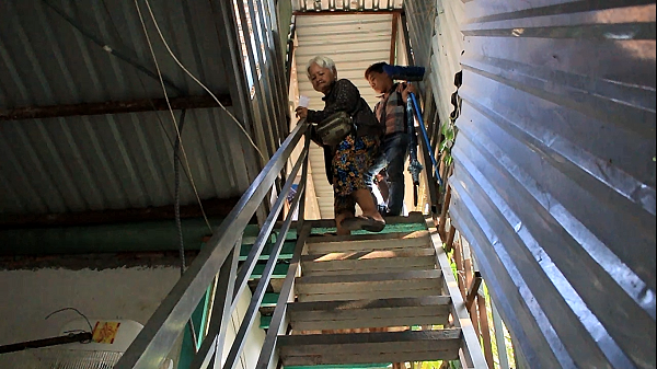 Đứa cháu Khánh Bình (13 tuổi) dìu bà bước từng bậc thang để leo xuống căn gác cao gần 10 mét