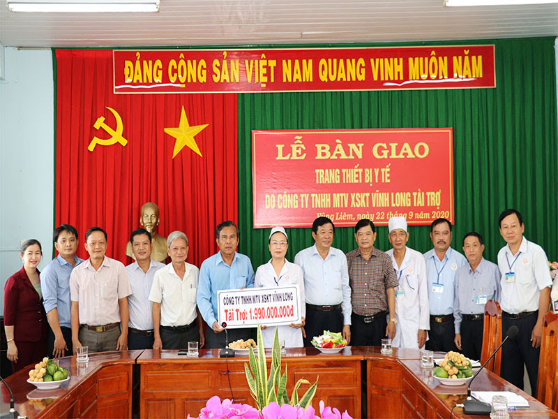 Ông Bùi Văn Nghiêm, Phó Bí thư Thường trực, Chủ tịch HĐND tỉnh Vĩnh Long. (thứ 6 từ phải sang) và ông Thiệu Ngọc Tâm, Chủ tịch kiêm Giám đốc Cty TNHH MTV XSKT Vĩnh Long (thứ 6 từ trái sang) bàn giao thiết bị y tế cho các bệnh viện, cơ sở y tế trên địa bàn tỉnh.