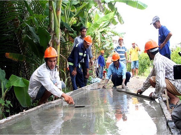 Người dân nông thôn tham gia lớp học đào tạo nghề xây dựng.