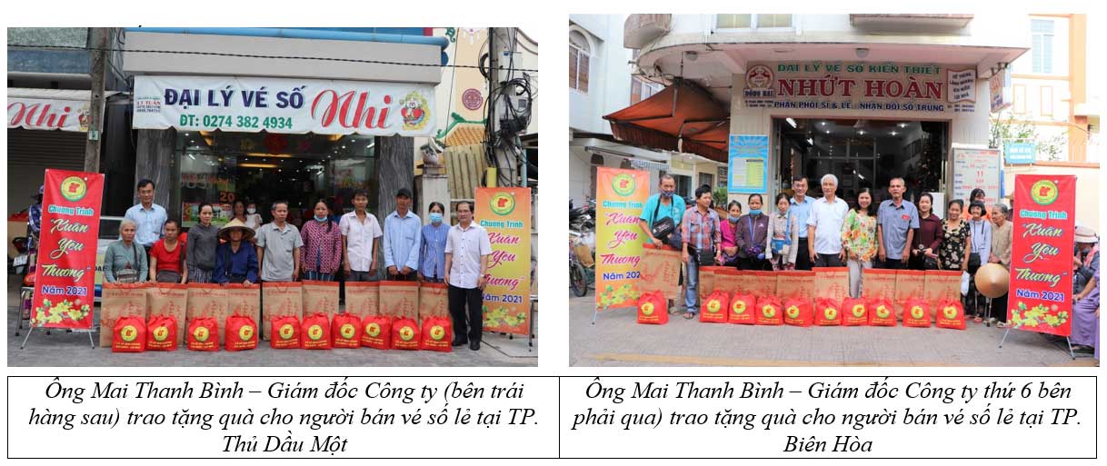 Nhằm ghi nhận những đóp góp đó, hàng năm Công ty TNHH MTV Xổ số kiến thiết Bình Dương thực hiện chương trình “Xuân yêu thương”, tặng quà cho những người bán vé số lẻ. Hành trình gần mười lăm năm qua đã trở thành một thông lệ, một nét đẹp của Công ty cũng như trở thành một niềm vui, niềm mong chờ của những người bán vé số lẻ khi xuân về.