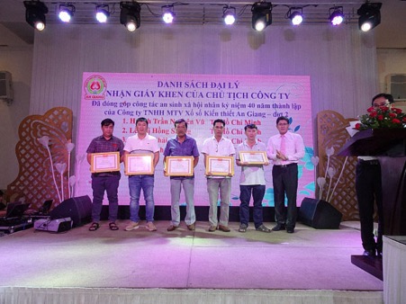 Ông Trần Văn Lắm – Bí thư Đảng ủy, Chủ tịch Công tytrao bằng khen của UBND Tỉnh cho các Đại lý đã có thành tích trong việc phát triển doanh thu tiêu thụ vé số An Giang