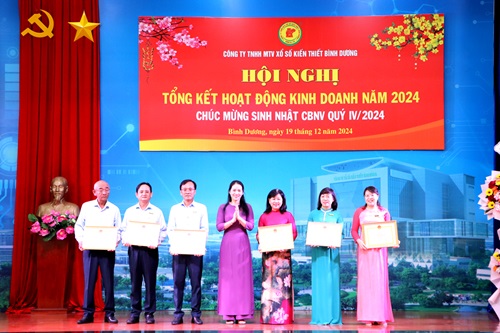 Sáng ngày 19/12/2024, Công ty TNHH MTV Xổ số kiến thiết Bình Dương đã tổ chức Hội nghị tổng kết hoạt động kinh doanh năm 2024 và kết hợp tổ chức sinh nhật quý IV cho cán bộ, nhân viên. Hội nghị có sự tham dự của Bà Nguyễn Thị Kim Mai – Chủ tịch Công ty, Ông Mai Thanh Bình – Giám đốc Công ty cùng các Ông, Bà là thành viên trong Ban Giám đốc, Trưởng Ban kiểm soát cùng toàn thể cán bộ, nhân viên Công ty.