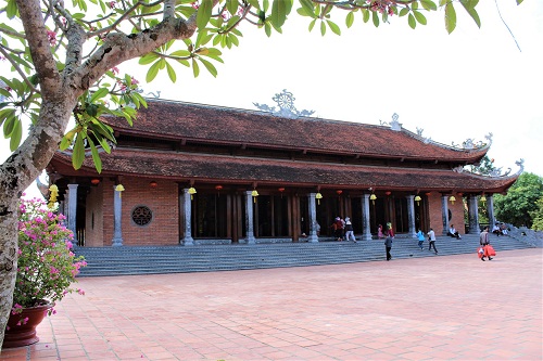 Cổng tam quanQua cổng bước vào trong là khoảng sân lát gạch đỏ tươirộng rãi dẫn đến chính điện, du khách sẽ thấy 2 hàng tượng các vị La Hán bằng đá hoa cương đặt song song. Dưới chân mỗi bức tượng đều khắc tên những vị anh hùng có công bảo vệ và xây dựng đất nước.Phía bên phải sân chính điện là tháp chuông mái cong cao vút được mô phỏng theo lối kiến trúc tháp chuông ở chùa Keo (Thái Bình), bên trong đặt đại hồng chung (chuông đồng) nặng 1,5 tấn. Bên trái sân là tháp trống với giá gỗ đặt trống được chạm trổ công phu, tinh xảo, mang tính nghệ thuật cao.Tất cả những hạng mục trên đều được làm từ khoảng 1.000 khối gỗ lim được nhập từ Nam Phi trực tiếp. Phần chánh điện lợp ngói tám mái theo phong cách thời vua triều Trần và Tổ điện lợp ngói bốn mái theo phong cách thời nhà Lý.