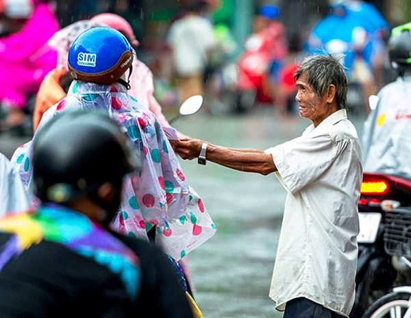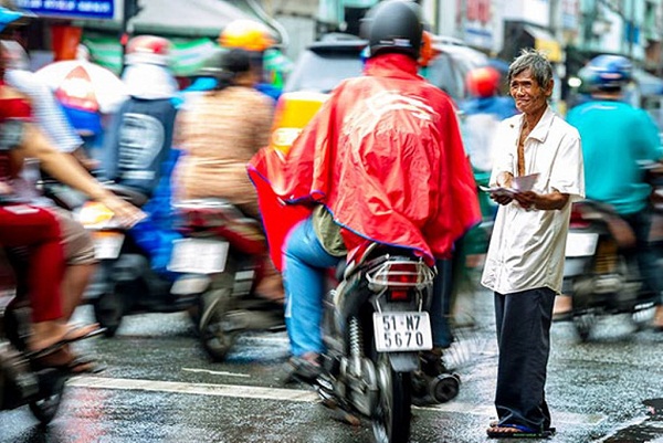 Một cụ già ngoài 70 tuổi đứng dưới mưa chìa những tấm vé số mời người đi đường nhưng không một ai ngó ngàng. Lo lắng vì sắp tới giờ xổ mà không bán được vé, ông mếu máo khóc. Nước mắt hòa lẫn vào những giọt nước mưa. Khoảnh khắc được chụp tại khu vực quận 6, TP.HCM