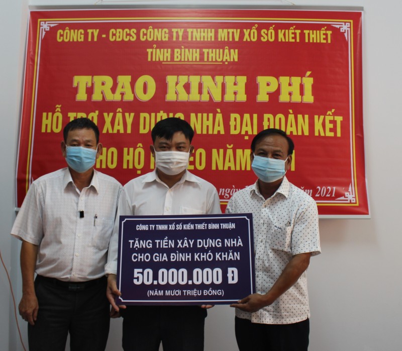 Những căn nhà được trao lần này được đầu tư xây dựng từ 50 đến hơn 70 triệu đồng. Trong đó, Công ty TNHH Xổ số kiến thiết Bình Thuận hỗ trợ 150 triệu đồng cho 03 hộ gia đình và Công đoàn cở sở Công ty TNHH Xổ số kiến thiết Bình Thuận hỗ trợ 50 triệu đồng cho hộ gia đình, số còn lại do gia đình và người thân đóng góp.