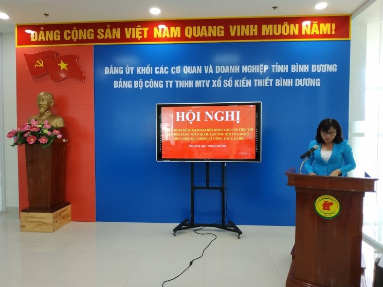Vào ngày 12/9/2019 vừa qua, Đảng ủy Công ty TNHH MTV Xổ số kiến thiết Bình Dương đã tổ chức Hội nghị triển khai kế hoạch tổ chức Đại hội Đảng các cấp tiến tới Đại hội Đại hội đại biểu toàn quốc lần thứ XIII của Đảng với sự tham gia của đảng viên toàn Đảng bộ. Tham dự và chỉ đạo hội nghị có đồng chí Nguyễn Thị Xuân Mai - Ủy viên Ban thường vụ, Phó Bí thư Đảng ủy khối các Cơ quan và Doanh nghiệp tỉnh Bình Dương (gọi tắt là Đảng ủy khối).