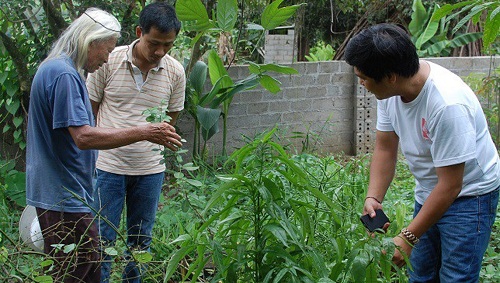 Cụ lang y Hoàng Văn Tài nói về công dụng của cây thuốc vừa hái với cán bộ VietHerb