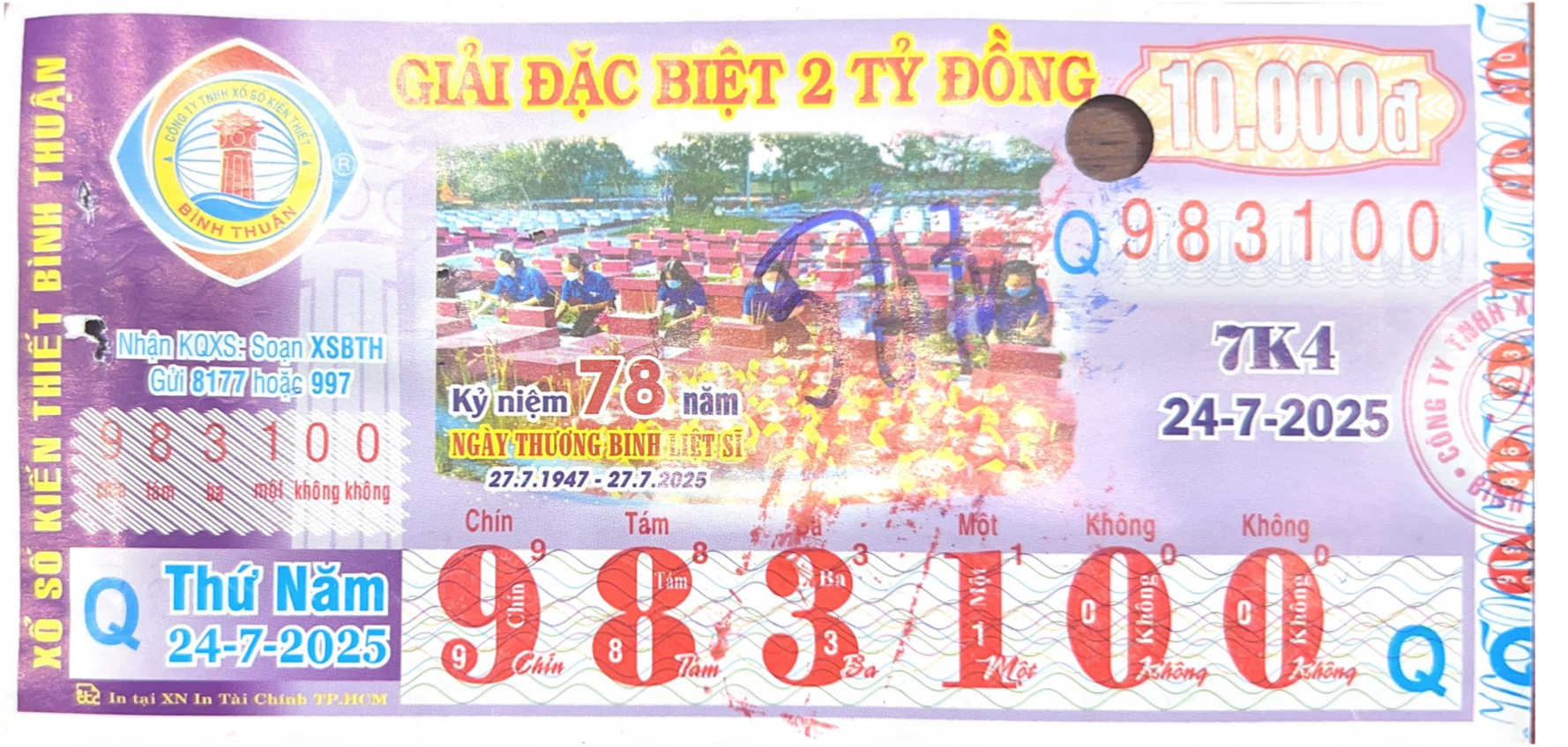 Công ty Xổ số Kiến thiết tỉnh Bình Thuận: Công bố thông tin trả thưởng kỳ vé 7k3