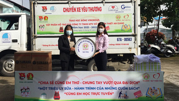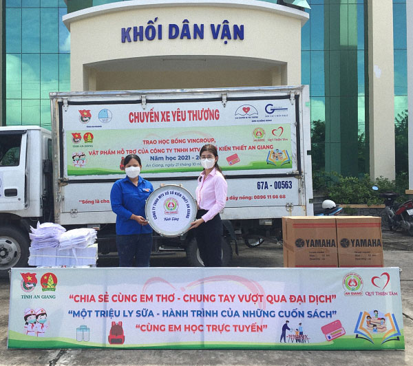 “Chuyến xe yêu thương” của Tỉnh Đoàn An Giang đã đồng hành cùng Công ty trao tặng cho các trường 6 bộ trống đội, 30 bộ đồng phục đội, 300 áo trắng học sinh, 3.000 quyển tập và 60 phần quà cho các em học sinh nghèo ở vùng sâu, vùng xa trên địa bàn các huyện Châu Thành, Châu Phú, An Phú, Tịnh Biên, Tri Tôn, Thoại Sơn và thành phố Châu Đốc, tổng giá trị gần 60 triệu đồng. Các hình ảnh trong hoạt động tài trợ đặc thù này: