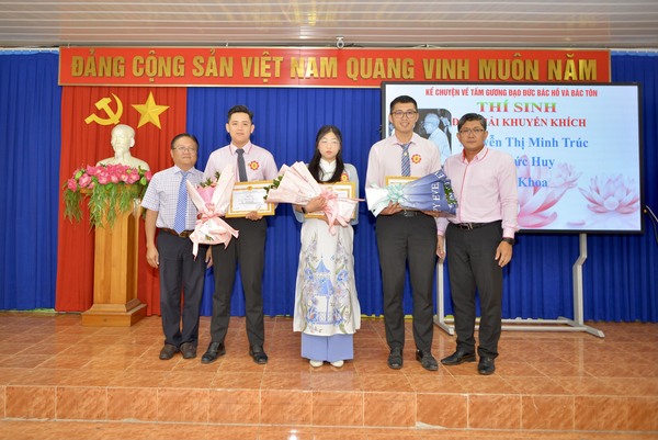 >Bà Phan Thị Kim Hai – Bí Thư Đảng ủy, Chủ tịch Công ty và>ông Lâm Văn Giàu –>Trưởng phòng Lý luận chính trị - Lịch sử Đảng, Ban Tuyên giáo Tỉnh ủy>trao giấy khen và hoa>cho 3 thí sinh xuất sắc đoạt giải Nhất, Nhì, Ba