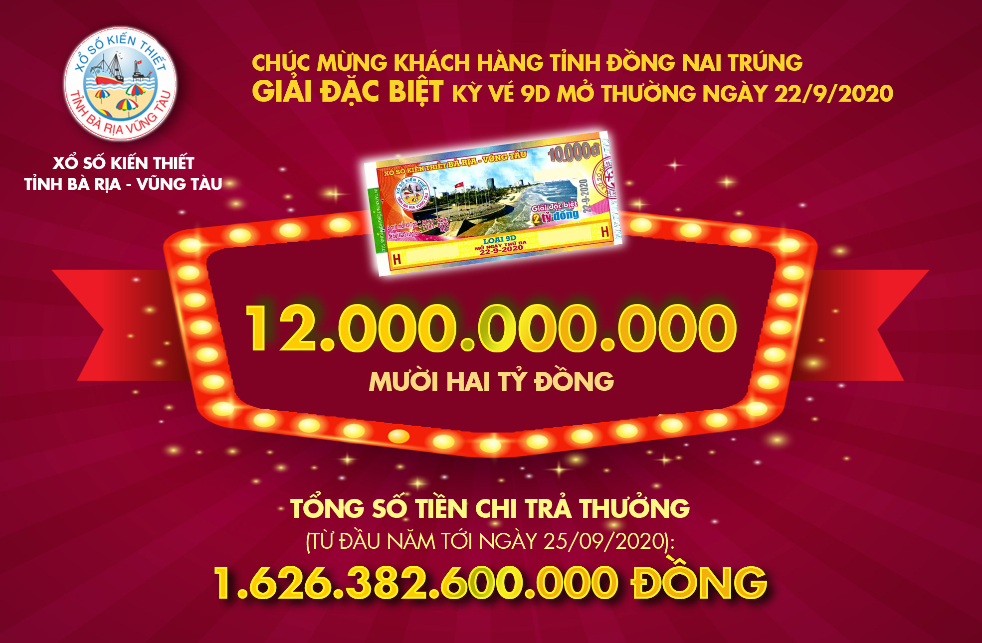 Tính từ đầu năm tới ngày 25/09/2020, tổng số tiền chi trả thưởng của Xổ số Kiến thiết (XSKT) Bà Rịa Vũng Tàu lên đến hơn1.626.382.600.000đồng. Lượng khách trúng thưởng của vé số Kiến thiết Bà Rịa - Vũng Tàu luôn gia tăng ở các tỉnh khu vực miền Nam.