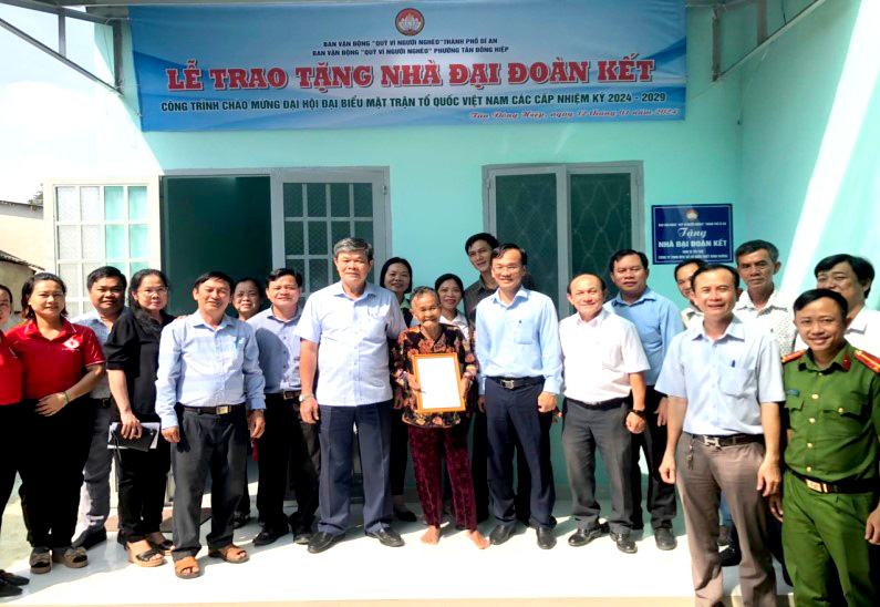 ÔngMai Thanh Bình- Giám đốc Công ty và Ông Trương Hoàng Hiệp – Phó Chủ tịch Công đoàn cơ sở cùng chính quyền địa phương trao nhà Đại đoàn kết cho hộ Bà Đoàn Thị Vàng, thành phố Dĩ An.