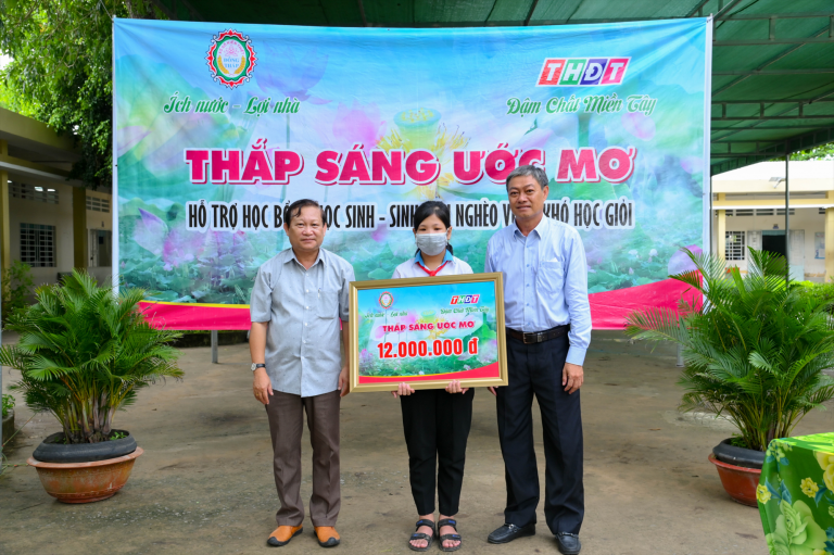 Đồng cảm và sẻ chia với hoàn cảnh của em Nguyễn Thị Ngọc Hiền, đại diện nhà tài trợ chính Công ty TNHH MTV Xổ số Kiến thiết Đồng Tháp, ông Hầu Minh Trí, Trưởng Phòng Thị trường – Chăm sóc khách hàng, đã gửi lời động viên chân tình và trao cho em suất học bổng trị giá 12 triệu đồng, nhằm hỗ trợ em giảm bớt gánh nặng kinh tế, tiếp thêm sức mạnh cho cô học trò nhỏ có thêm động lực vươn lên trong học tập. Nhân dịp này, Chính quyền địa phương và các mạnh thường quân cũng trao đến em những phần quà hỗ trợ, chung tay giúp em hoàn thành việc học.