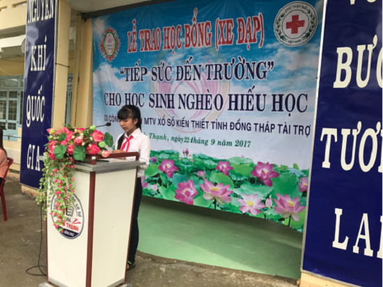 Phát biểu tại buổi lễ trao tặng,Đại diện các em học sinhgửi lời cảm ơn tớiCông ty TNHH MTV Xổ số kiến thiết tỉnh Đồng Thápđã chung tay, góp sức vì sự nghiệpđào tạo thế hệ mớivàxin hứa sẽtiếp tục cố gắng vượt khó vươn lên trong học tập để sau này trở thành những người có ích cho xã hội, góp phần vào việc xây dựng quê hương ngày càng giàu đẹp.