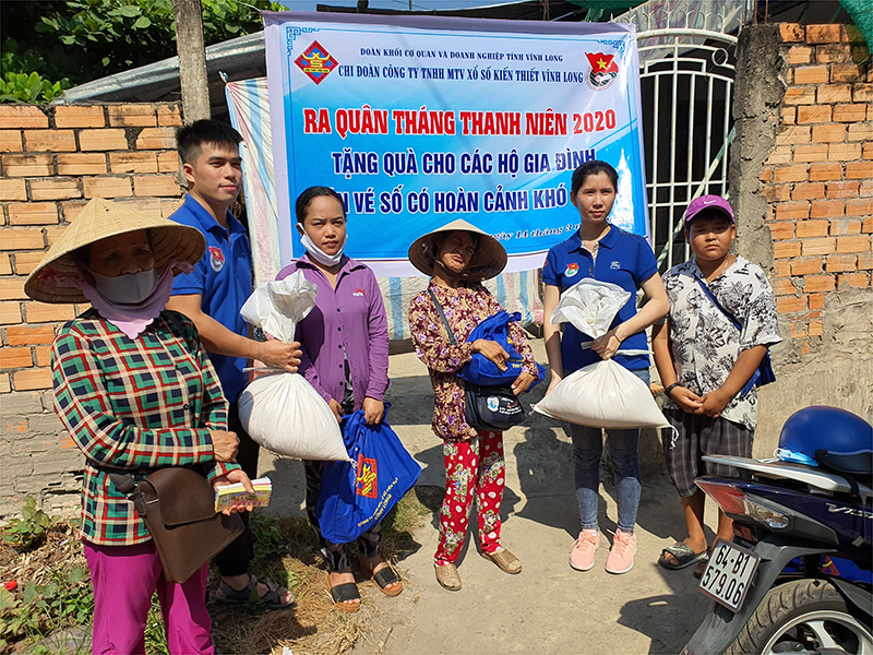 Theo lãnh đạo Công ty,thực hiện Kết luận của Ban Thường vụ Tỉnh ủy, Chỉ thị của UBND tỉnh, lời kêu gọi của Ủy ban MTTQ Việt Nam tỉnh và kết quả khảo sát của Sở LĐ-TB&XH, Công ty TNHH MTV Xổ sốKiến thiết Vĩnh Longđãthực hiện việc hỗ trợ2.008 phần quàcho người bán vé số,mỗiphần quà trị giá 750.000đồng(bao gồm tiền, quà, khẩu trang, nước rửa tay diệt khuẩn) với tổng kinh phí 1,750 tỷ đồng. Trong đó 1.548người được phátthông qua ủy ban MTTQ Việt Nam8 huyện,thịxã, thành phố;460 phần Công ty tự phát thông qua đại lý Công ty và hỗ trợ Chi đoàn thực hiện,nhằm hỗ trợ phần nào khó khăn trong thời gian tạm dừng hoạt động kinh doanhXổ sốKiến thiết.