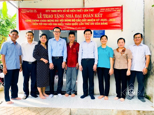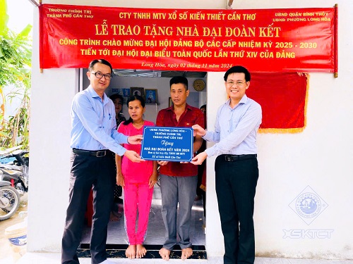 Sáng nay 02/11/2024, tại KV Bình Dương, phường Long Hòa, quận Bình Thủy, Công ty TNHH Nhà nước một thành viên Xổ số kiến thiết Cần Thơ phối hợp Uỷ ban Mặt trận Tổ quốc Việt Nam phường Long Hòa, Trường Chính Trị Thành phố Cần Thơ tổ chức lễ bàn giao nhà Đại đoàn kết cho gia đình ông Võ Văn Tâm – một hộ nghèo trên địa bàn. Đây là hoạt động hướng tới chào mừng đại hội Đảng bộ các cấp nhiệm kỳ 2025-2030 và đại hội đại biểu toàn quốc lần thứ XIV của Đảng.