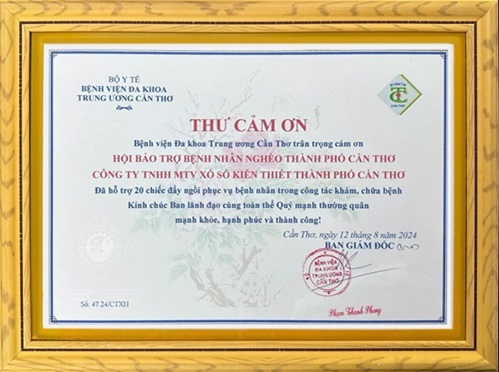 Đại diện Công ty TNHH Nhà nước Một thành viên Xổ số kiến thiết Cần Thơ đã trao tặng 20 chiếc xe đẩy ngồi để hỗ trợ cho bệnh nhân, người cao tuổi đến bệnh viện khám và điều trị được di chuyển dễ dàng hơn. Thông qua hoạt động ý nghĩa này, Công ty mong muốn được chia sẻ một phần khó khăn đối với những người nghèo, đặc biệt là người khuyết tật.