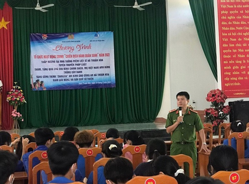 Thiếu tá Nguyễn Thanh Hùng, Phó Đội trưởng Đội Cảnh sát điều tra, kiêm Bí thư đoàn cơ sở của Công an huyện Hàm Thuận Bắc đang tổ chức hoạt động tuyên truyền pháp luật, phát động phong trào quần chúng tham gia đấu tranh, phòng chống tội phạm.