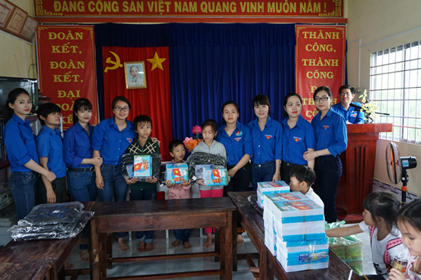Các ban đoàn viên Chi đoàn Xổ Số Cà Mau trao quà cho các em học sinh.