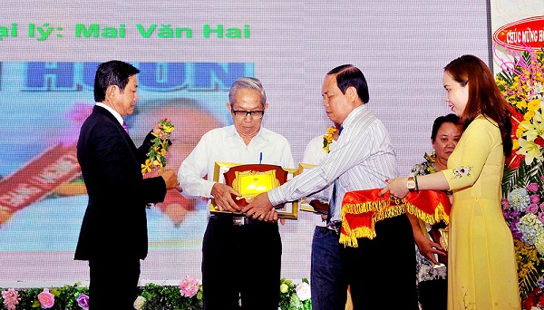 Chủ tịch UBND tỉnh Vương Bình Thạnh và Chủ tịch Công ty TNHH MTV Xổ số kiến thiết An Giang Trần Văn Lắm tặng Bằng khen và hoa cho các đại lý vé số có thành tích tốt năm 2018.