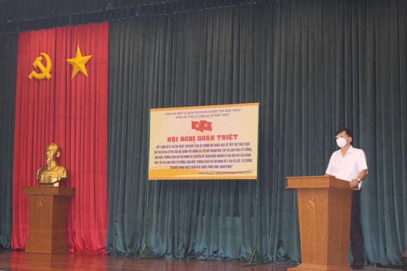 Ngày 26/10/2021vừa qua, Đảng bộ Công ty TNHH Xổ số kiến thiết Bình Thuận đã tổ chức Hội nghị quán triệt “Kết luận số 01-KL/TW, ngày 18/5/2021 của Bộ Chính trị (khóa XIII) về đẩy mạnh học tập và làm theo tư tưởng, đạo đức, phong cách Hồ Chí Minh và Chuyên đề toàn khóa nhiệm kỳ Đại hội XIII của Đảng “Học tập và làm theo tư tưởng, đạo đức, phong cách Hồ Chí Minh về ý chí tực lực, tự cường và khát vọng phát triển đất nước phồn vinh, hạnh phúc”, cho toàn thể người quản lý, người lao động, đoàn viên, hội viên của Công ty. Do tình hình dịch bệnh COVID -19, để đảm bảo công tác phòng chống dịch bệnh, Đảng bộ Công ty tổ chức 2 điểm cầu(Hội trường và phòng họp), thời gian học tập thành 2 đợt: buổi sáng bắt đầu thừ 08h00 đến 10h00(Đợt 1), buổi chiều bắt đầu từ 14h00 đến 16h00(Đợt 2) tại Công ty để quán triệt.