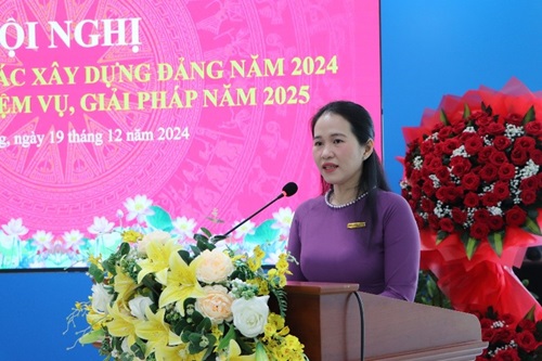 Tại Hội nghị, đồng chí Lê Thị Mỹ Dung – Phó Bí thư Đảng ủy đã trình bày kết quả công tác xây dựng Đảng năm 2024 và triển khai phương hướng, nhiệm vụ trọng tâm năm 2025. Trong năm 2024, Đảng bộ đã lãnh đạo, chỉ đạo và tổ chức triển khai kịp thời, đầy đủ các chỉ thị, nghị quyết của Đảng, pháp luật của nhà nước, các văn bản chỉ đạo của cấp trên đến toàn thể cán bộ, đảng viên, người lao động bằng nhiều hình thức đa dạng, phong phú; tập trung tổ chức học tập và làm theo tư tưởng, đạo đức, phong cách Hồ Chí Minh, duy trì các mô hình "làm theo Bác"; quán triệt và triển khai thực hiện Quy định số 144-QĐ/TW ngày 09/5/2024 của Bộ Chính trị về chuẩn mực đạo đức cách mạng của cán bộ, đảng viên trong giai đoạn mới. Tổ chức nhiều đợt sinh hoạt chính trị, sinh hoạt chuyên đề thông qua các hình thức hội nghị kiểm điểm, tự phê bình và phê bình, trong các kỳ sinh hoạt Đảng, chính quyền, đoàn thể; sinh hoạt chuyên đề về công tác bảo vệ nền tảng tư tưởng và phản bác các quan điểm sai trái, thù địch trên địa bàn tỉnh Bình Dương; sinh hoạt chuyên đề kỷ niệm 55 năm thực hiện Di chúc của Chủ tịch Hồ Chí Minh (1969-2024) và 55 năm ngày mất của Người (02/9/1969 – 02/9/2024),... qua đó góp phần nâng cao nhận thức, hành động đúng đắn cho cán bộ, đảng viên. Công tác kiểm tra, giám sát được Đảng ủy, UBKT Đảng ủy và các cấp ủy Chi bộ trực thuộc quan tâm thực hiện theo Kế hoạch đã đề ra. Nâng cao chất lượng công tác sinh hoạt chi bộ; chú trọng chất lượng công tác phát triển đảng viên, kết quả trong năm đã kết nạp được 07 đảng viên mới, đạt 140% chỉ tiêu nghị quyết đề ra, nâng tổng số đảng viên toàn đảng bộ lên 72 đồng chí. Lãnh đạo xây dựng kế hoạch và triển khai tốt công tác chuẩn bị tổ chức Đại hội Đảng bộ nhiệm kỳ 2025-2030 và Đại hội cấp chi bộ trực thuộc nhiệm kỳ 2025-2027. Lãnh đạo các tổ chức Công đoàn cơ sở, Chi đoàn cơ sở hoàn thành xuất sắc nhiệm vụ.