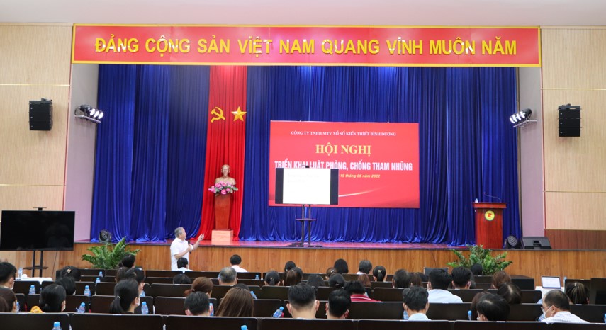 Ngày 19/5/2022, Công ty TNHH MTV Xổ số kiến thiết Bình Dương đã tổ chức Hội nghị triển khai Luật Phòng, chống tham nhũng cho toàn thể cán bộ, nhân viên Công ty. Tham dự hội nghị có Bà Nguyễn Thị Kim Mai, Bí thư Đảng ủy, Chủ tịch Công ty; Ông Mai Thanh Bình, Giám đốc Công ty và 100 cán bộ, nhân viên. Báo cáo viên của hội nghị là Ông Ngô Hoàng Luân, Phó Trưởng Ban Nội chính, Tỉnh ủy Bình Dương.