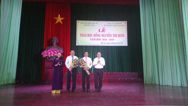 Chiều ngày 04/09/2018, Hội Liên hiệp Phụ nữ tỉnh Bến Tre, phối hợp cùng Công ty TNHH MTV Xổ số Bến Tre và An Giang, tổ chức lễ trao học bổng Nguyễn Thị Định cho học sinh, sinh viên nghèo hiếu học, trên địa bàn tỉnh Bến Tre, do Công ty TNHH MTV Xổ số Kiến thiết An Giang tài trợ,trong chương trình tài trợ đối ứng học bổng, giữa Công ty TNHH MTV Xổ số Kiến thiết An Giang và các công ty xổ số kiến thiết trong khu vực.