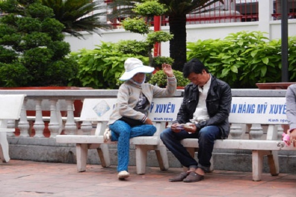 Những người bán vé số dạo ở trước cổng vào khu Miếu Bà Chúa Xứ