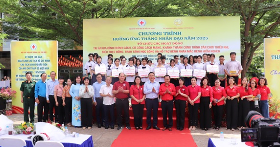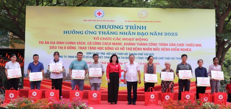 Trước đó, trong 2 ngày 07 và 08 tháng 5, hưởng ứng Lễ phát động Tháng Nhân đạo cấp quốc gia 2025, Hội Chữ thập đỏ TP.HCM phối hợp cùng Công ty TNHH MTV Xổ số Kiến thiết TP.HCM đã trao hỗ trợ 130 suất kinh phí điều trị bệnh cho người mắc bệnh hiểm nghèo có hoàn cảnh khó khăn và 185 suất học bổng cho học sinh nghèo, vượt khó, hiếu học tại TP Thủ Đức, huyện Bình Chánh, Cần Giờ, Củ Chi, Hóc Môn và quận Bình Thạnh.