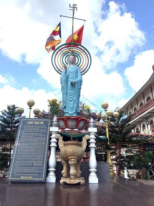 Tượng Phật Quán Thế Âm Bồ Tát màu lam ngọc ngự trên đài sen trước chùa