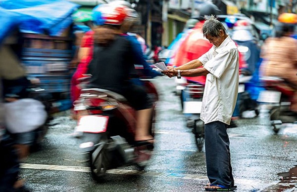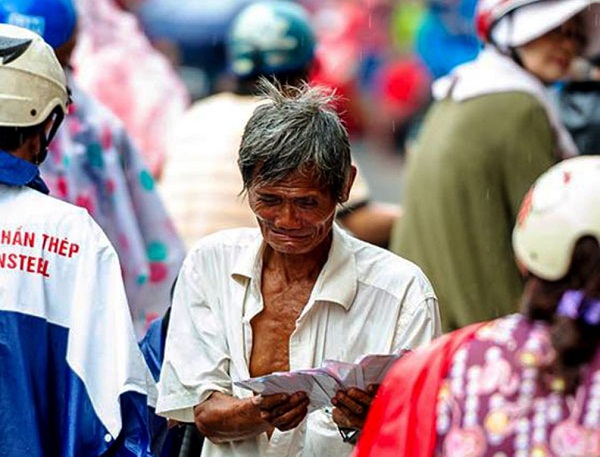 Một cụ già ngoài 70 tuổi đứng dưới mưa chìa những tấm vé số mời người đi đường nhưng không một ai ngó ngàng. Lo lắng vì sắp tới giờ xổ mà không bán được vé, ông mếu máo khóc. Nước mắt hòa lẫn vào những giọt nước mưa. Khoảnh khắc được chụp tại khu vực quận 6, TP.HCM