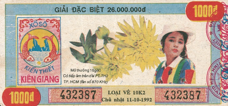 Từ năm 1990-1993, vé số Kiên Giang có mệnh giá lần lượt là 1.000 đồng và 2.000 đồng.