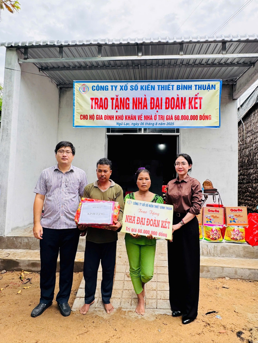 Ngày 06/8, Công ty TNHH MTV Xổ số kiến thiết Bình Thuận (XSKT Bình Thuận) đã phối hợp cùng chính quyền địa phương các xã Tân An, Ngũ Lạc và phường Long Đức, tỉnh Vĩnh Long tổ chức lễ bàn giao 3 căn nhà Đại doàn kết cho 3 hộ gia đình có hoàn cảnh khó khăn trên địa bàn, tổng giá trị là 180 triệu đồng.