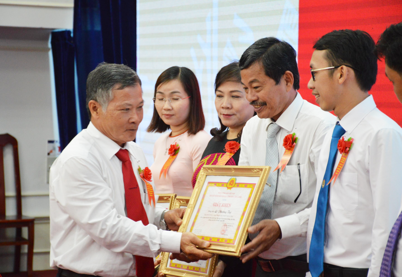 Đ/c Đinh Kim Phận Đại diên Đảng bộ công ty (thứ ba bên phải), Đ/c Trần Thị Thanh Nhi (thứ năm bên phải) đại diện Chi bộ Phòng Trả thưởng trực thuộc Đảng bộ công ty lên nhận Giấy khen biểu dương tập thể điển hình của Đảng ủy Dân chính Đảng trong “Học tập và làm theo tấm gương đạo đức, phong cách Hồ Chí Minh” năm 2020