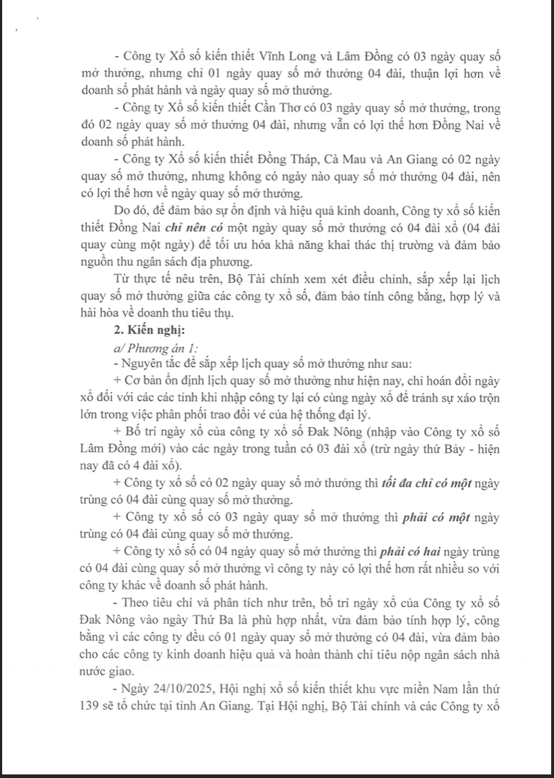 Theo nội dung của văn bản này, hiện tại XSKT Đồng Nai có 02 ngày quay số mở thưởng (Thứ Tư và Thứ Bảy) nhưng đều được xếp lịch vào đúng hai ngày có 04 đài cùng quay số, việc sắp xếp như vậy là rất bất hợp lý.