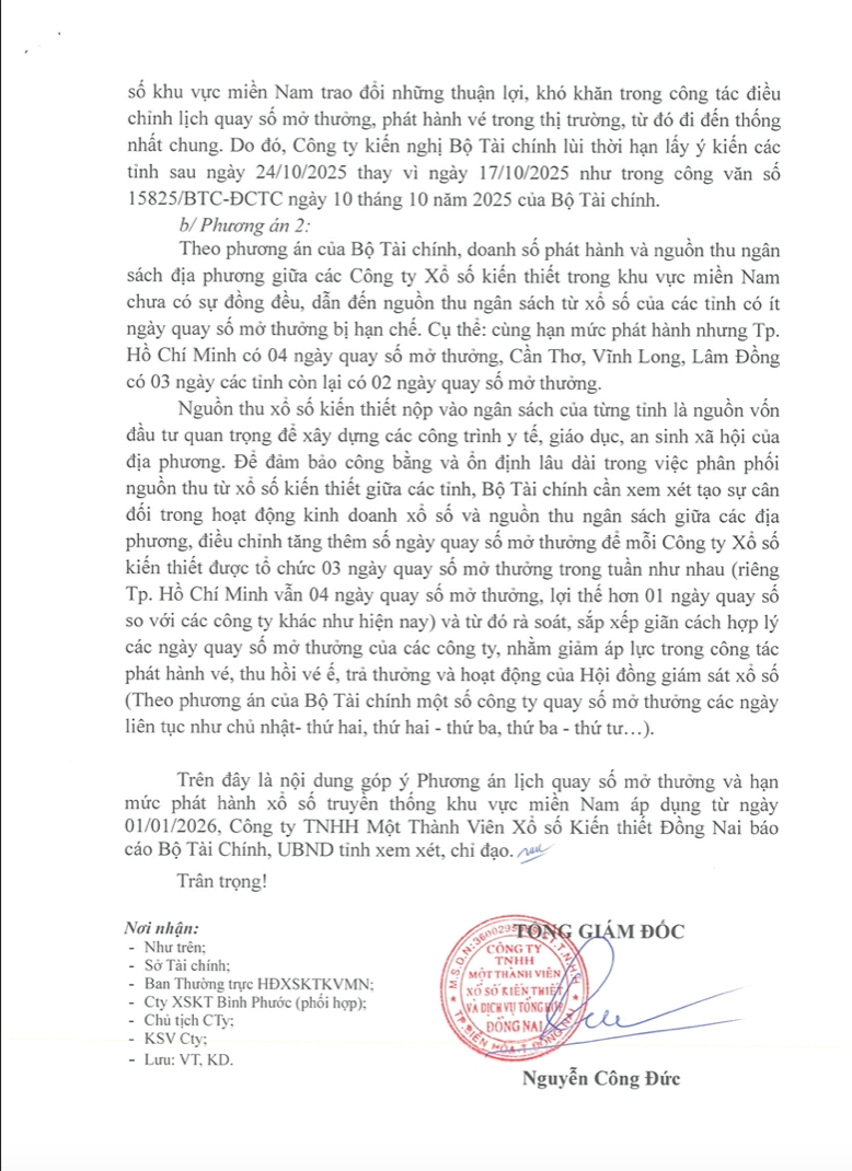 Ngày 15/10, Công ty TNHH Một Thành Viên Xổ số Kiến thiết Đồng Nai (XSKT Đồng Nai) có văn bản trình UBND tỉnh Đồng Nai và Bộ Tài Chính góp ý phương án lịch quay số mở thưởng và hạn mức phát hành xổ số truyền thống khu vực miền Nam áp dụng từ ngày 01/01/2026.
